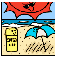 - 水分をしっかり取り、こまめに似影で休憩しましょう。日焼け止めを必ず塗りましょう。