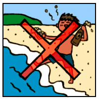 - 浜へ戻れなくなったり、溺れている人を見つけたときは、浜に向かって大きく手を振りましょう。