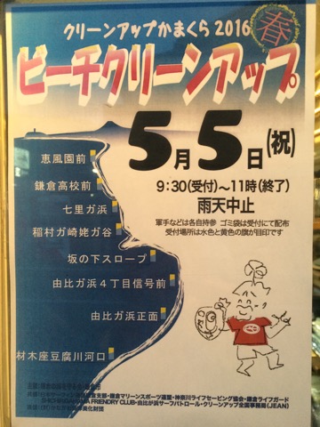 【告知・地域活動】ビーチクリーンアップかまくら2016 2016.04.15 NEWS一覧 【告知・地域活動】ビーチクリーンアップかまくら2016 毎年恒例のビーチクリーンアップかまくらが今年のゴールデンウィークも開催されます。 日時:5月5日(祝)9:30(受付)〜11:00(終了) 場所:材木座〜七里ガ浜の各所 主催:鎌倉の海を守る会・鎌倉市 鎌倉ライフガードも参加いたします。ぜひお近くの受付よりご参加ください。 皆様の参加をお待ちしております。
