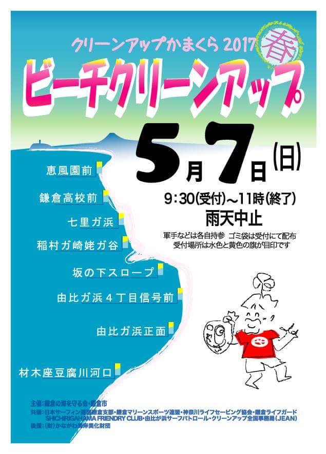 【告知・地域活動】5/7 ビーチクリーンアップかまくら 2017.05.01 NEWS一覧 【告知・地域活動】5/7 ビーチクリーンアップかまくら 5月7日に鎌倉の各ビーチにてビーチクリーンアップかまくらが開催されます。 日程:5月7日(日) ※雨天中止予備日なし 時間:9時半受付開始〜11時 場所:鎌倉の各海岸 (受付詳細はポスターをご覧ください) 持ち物:軍手、トング等(必要な方のみ) 参加方法:各海岸の受付でゴミ袋を受け取りご参加下さい 鎌倉の海を守る会主催の一斉ビーチクリーンとなります。これから本格的な海のシーズンが始まる前にみんなでビーチを綺麗にしよう! 地域活動委員会
