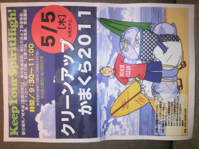 クリーンアップかまくら2011 2011.04.28 NEWS一覧 今年のゴールデンウィークにも毎年恒例のクリーンナップかまくらが開催されます。 5月5日(木) 9:30〜11:00 詳細は画像ご覧ください。 鎌倉ライフガードは材木座で参加予定です。